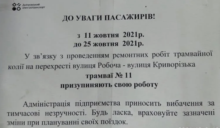 В Днепре на маршруте №11 временно не будут ездить трамваи. В вагонах развесили объявления с предупреждением. Там сказано, что транспорт прекратит свое движение в связи с ремонтными работами. Будут ремонтировать трамвайные пути на перекрестке улиц Рабочей и Криворожской. Электротранспорт не будет курсировать с 11 октября по 25 октября. На участке проведения работ должны будут установить временные дорожные знаки и ограждения с сигнальным освещением. Кроме этого, обеспечат безопасное движение для пешеходов.
