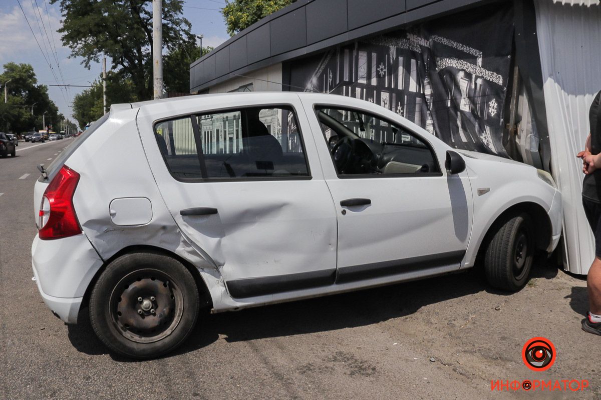 Сегодня, 9 июля, на улице Калиновой Renault столкнулся с Chevrolet, а затем врезался в торговый павильон.