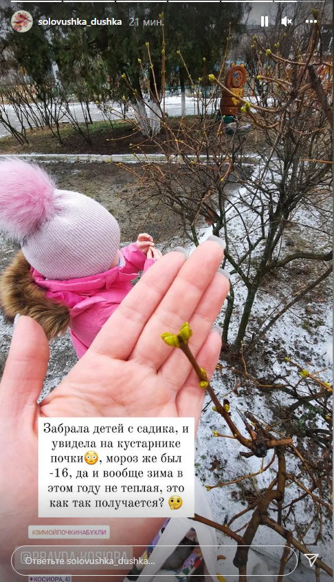 Забрала детей из садика и увидела на кустарнике почки. Мороз же был -16, да и вообще зима теплая. Это как так получается, - отметила днепрянка Светлана в своих сторис.