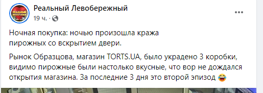В ночь на 13 декабря, на ринке Образцова ограбили кондитерский магазин. Около трех часов ночи неизвестный проник в магазин TORTS.UA. Он предварительно взломал дверь, а после забежал внутрь, схватил три коробки с пирожными и убежал. Об этом рассказали в "Реальном Левобережном".