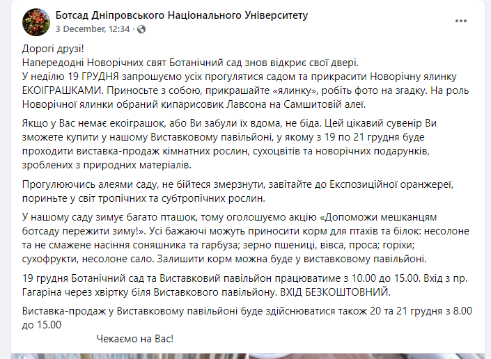 19 декабря, в ботсаду ДНУ все желающие смогут украсить елку эко-игрушками. Наряжать будут кипарисовик Лавсона на Самшитовой аллее. Если у вас нет своих украшений, то купить их можно будет в Выставочном павильоне.