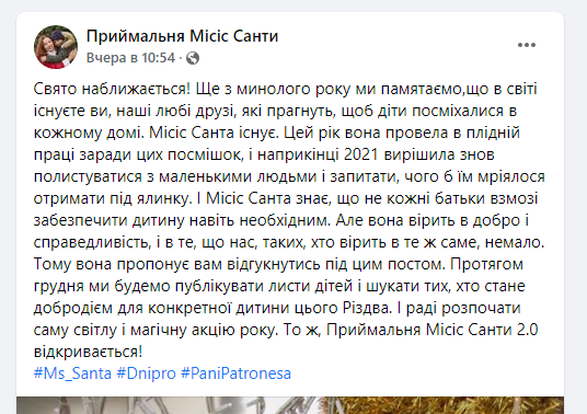 Миссис Санта будет посещать детей Днепра уже второй год подряд. Организовала эту инициативу специалист фонда ООН в сфере народонаселения в Украине Анна Карпеченкова.