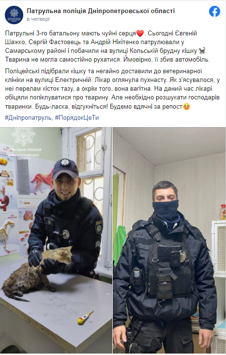 В Днепре 9 декабря трое патрульных на улице Кольской увидели грязную кошку.