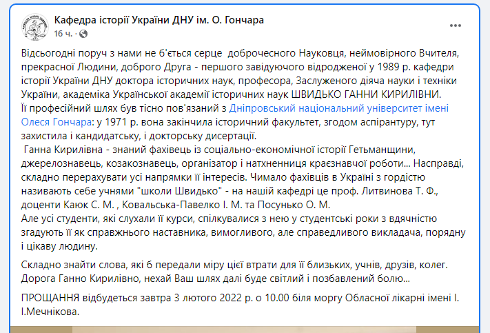 Об этом сообщили сотрудники кафедры истории Украины ДНУ им. О. Гончара на своей странице в Facebook.