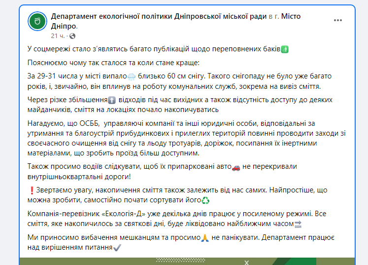 Такой мусорный коллапс они объясняют тем, что накануне Нового года в Днепре выпала месячная норма снега. Также, во время праздничных дней количество отходов значительно увеличилось, а свободно добраться до баков в некоторых местах было сложно. В департаменте экологической политики просят не паниковать. Компания, которая занимается вывозом мусора уже начала устранять проблему и работает в усиленном режиме.