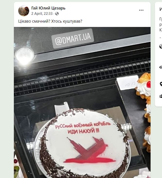 Фотографию торта опубликовали в группе на фейсбуке "Чечеловка Днепр". Так, в одном из магазинов Днепра продают торт, на котором кремом нарисовали легендарную фразу, сопровождающую украинское сопротивление российскому вторжению. Автор публикации интересуется тем, вкусный ли торт.