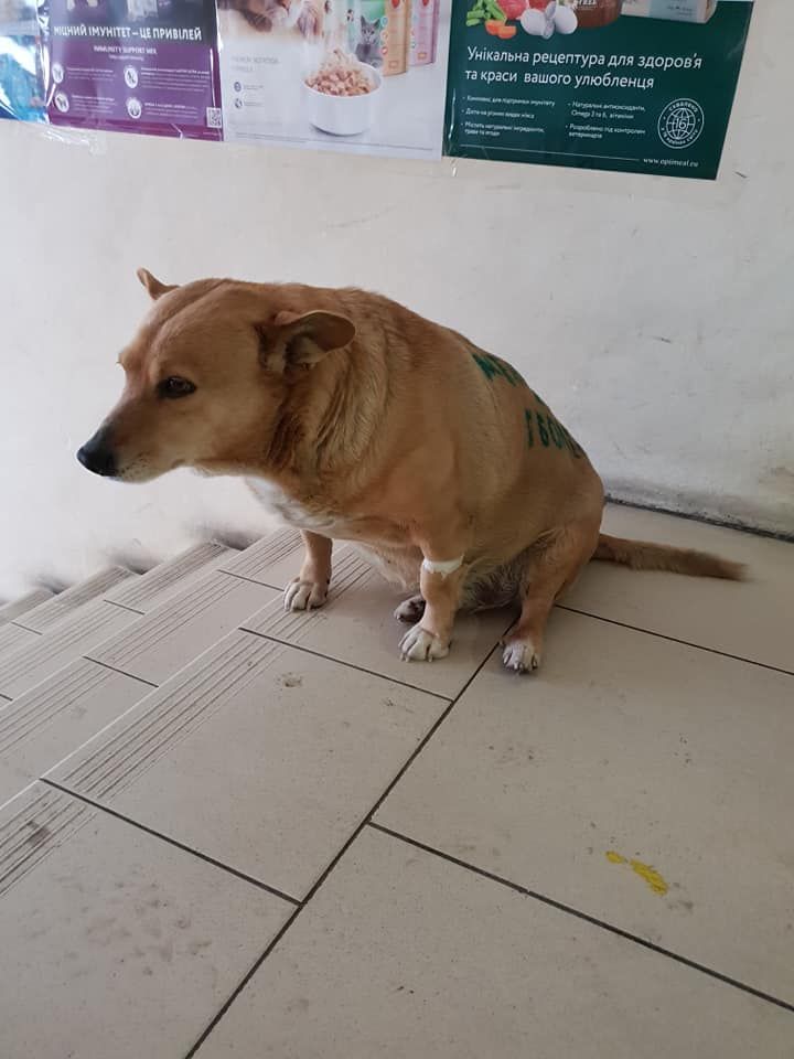 Люди его кормят в основном жирной пищей, которую ему нельзя. Ветеринары не смогли придумать ничего лучше, чем написать зеленкой на собаке фразу «Не кормить меня жирным! Я болею». По сути, большого выбора у них не было, но люди уже начали жаловаться, и обещали обратиться в общества по защите животных.