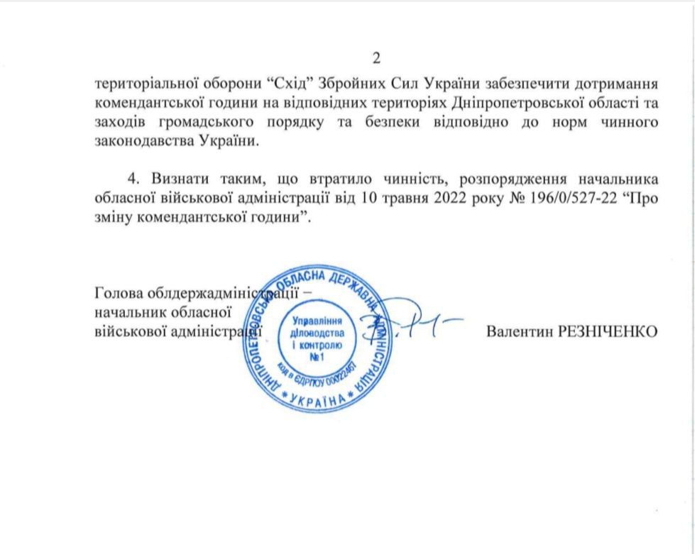Так, с 25 июня комендантский час в Днепре и Каменском будет начинаться в 00:00 (раньше - с 23:00), а заканчиваться, как и раньше, в 5:00.