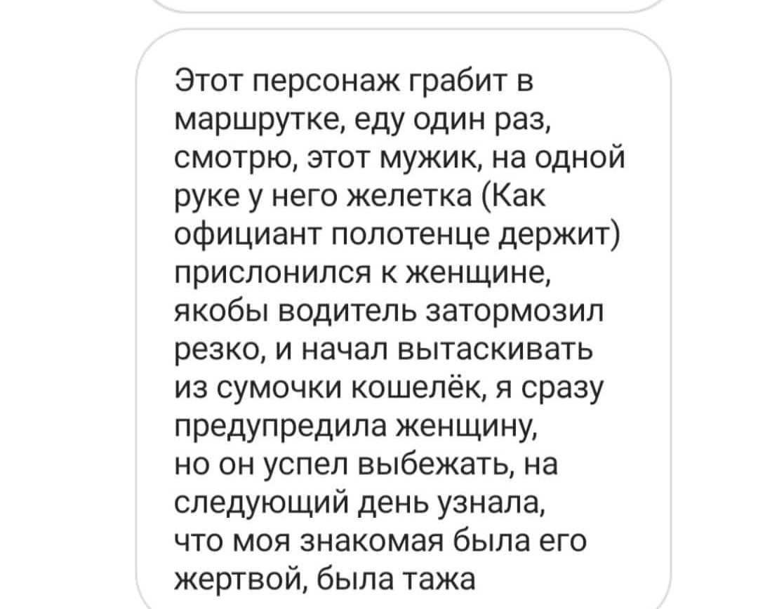 Кроме квартир злоумышленники орудуют и в маршрутках. Мужчина, которого удалось четко зафиксировать на камеру во время одной из краж в квартире, ездил в маршрутках и прикрывался жилеткой на руке. Потом, он резко мог прислониться к вам, будто бы водитель резко затормозил.