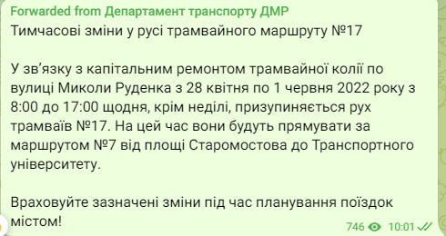 Об этом сообщает департамент транспорта и транспортной инфраструктуры Днепровского городского совета.