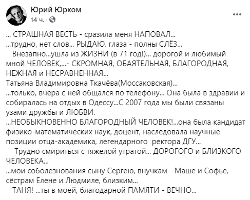 Печальные новости: ушла из жизни известный ученый, кандидат физико-математических наук, доцент Татьяна Владимировна Ткачёва (Моссаковская) - дочь Почетного ректора университета, выдающегося ученого, академика Владимира Ивановича Моссаковского. Об этом рассказал на своей ФБ-странице журналист Юрий Юрком.