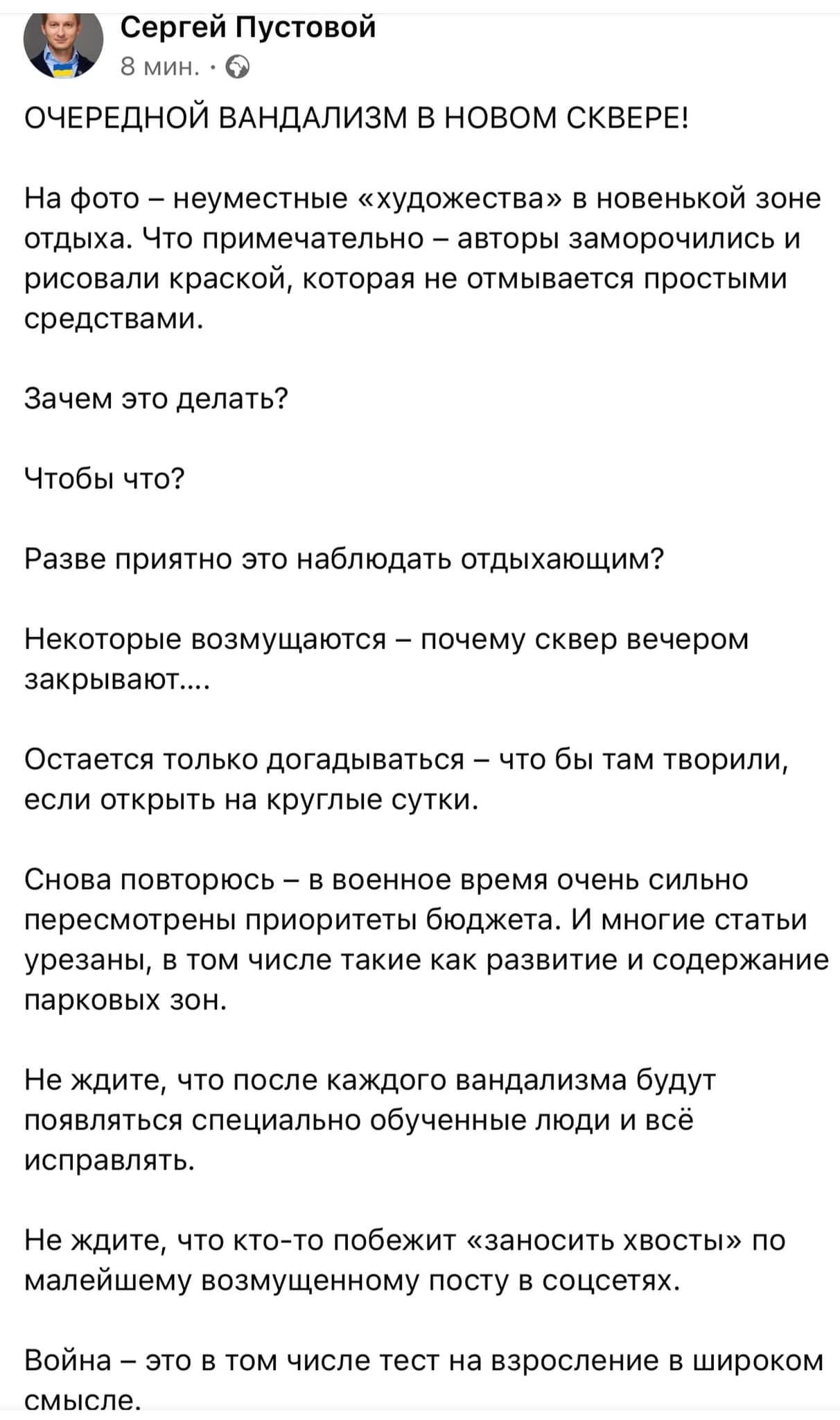 "Зачем это делать? Чтобы что? Разве приятно это наблюдать отдыхающим? Некоторые возмущаются – почему сквер вечером закрывают…. Остается только догадываться – что бы там творили, если открыть на круглые сутки. Снова повторюсь – в военное время очень сильно пересмотрены приоритеты бюджета. И многие статьи урезаны, в том числе такие, как развитие и содержание парковых зон. Не ждите, что после каждого вандализма будут появляться специально обученные люди и всё исправлять. Не ждите, что кто-то побежит «заносить хвосты» по малейшему возмущенному посту в соцсетях. Война – это в том числе тест на взросление в широком смысле", - написал Сергей Пустовой.