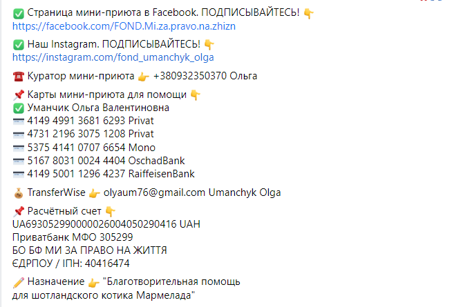 Волонтер просит всех у кого есть возможность помочь приюту материально. Если вы хотите спасти Мармеладика, реквизиты на скрине: