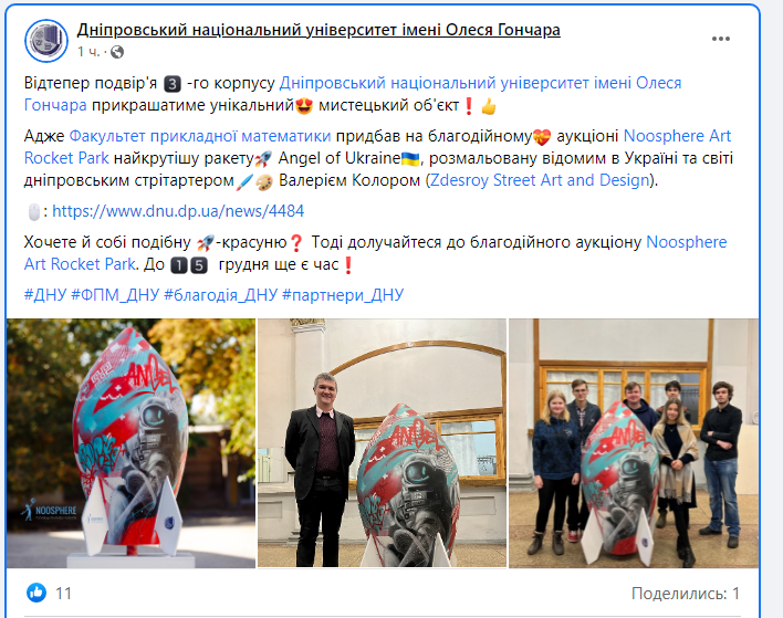 Факультет прикладной математики также приобрел арт-ракету на аукционе. Ее разрисовал стрит-артер Валерий Колокол. Теперь двор 3-го корпуса ДНУ будет украшать космическая ракета.