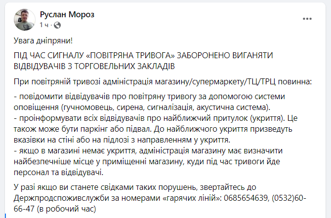 Во время воздушной тревоги в Днепре запрещено выгонять покупателей из торговых заведений.