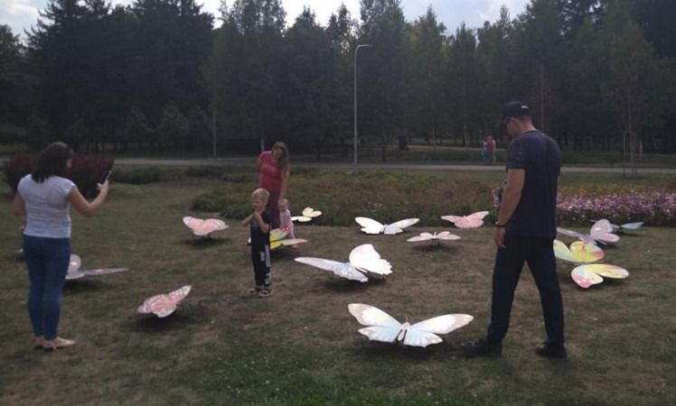 По ее словам, кроме украшения газонов парка, бабочки были установлены для организации фотозоны.