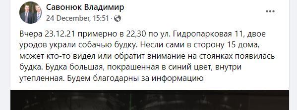 По словам мужчины, возле подъезда дома по адресу улица Гидропарковая, 11 стояла собачья будка. Но в канун католического Рождества, кто-то ее украл. Момент кражи попал на камеры видеонаблюдения.