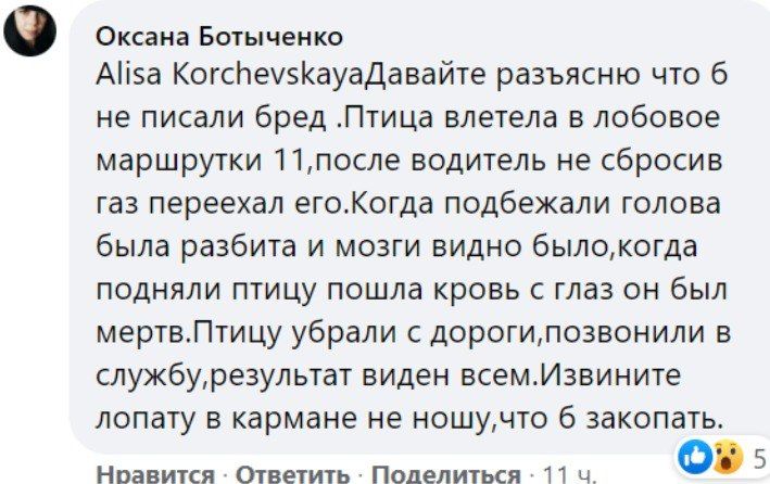 Однако, предположения оказались ложными, их развенчала очевидица Оксана. Она рассказала, что пернатого сбила маршрутка, а затем переехала.