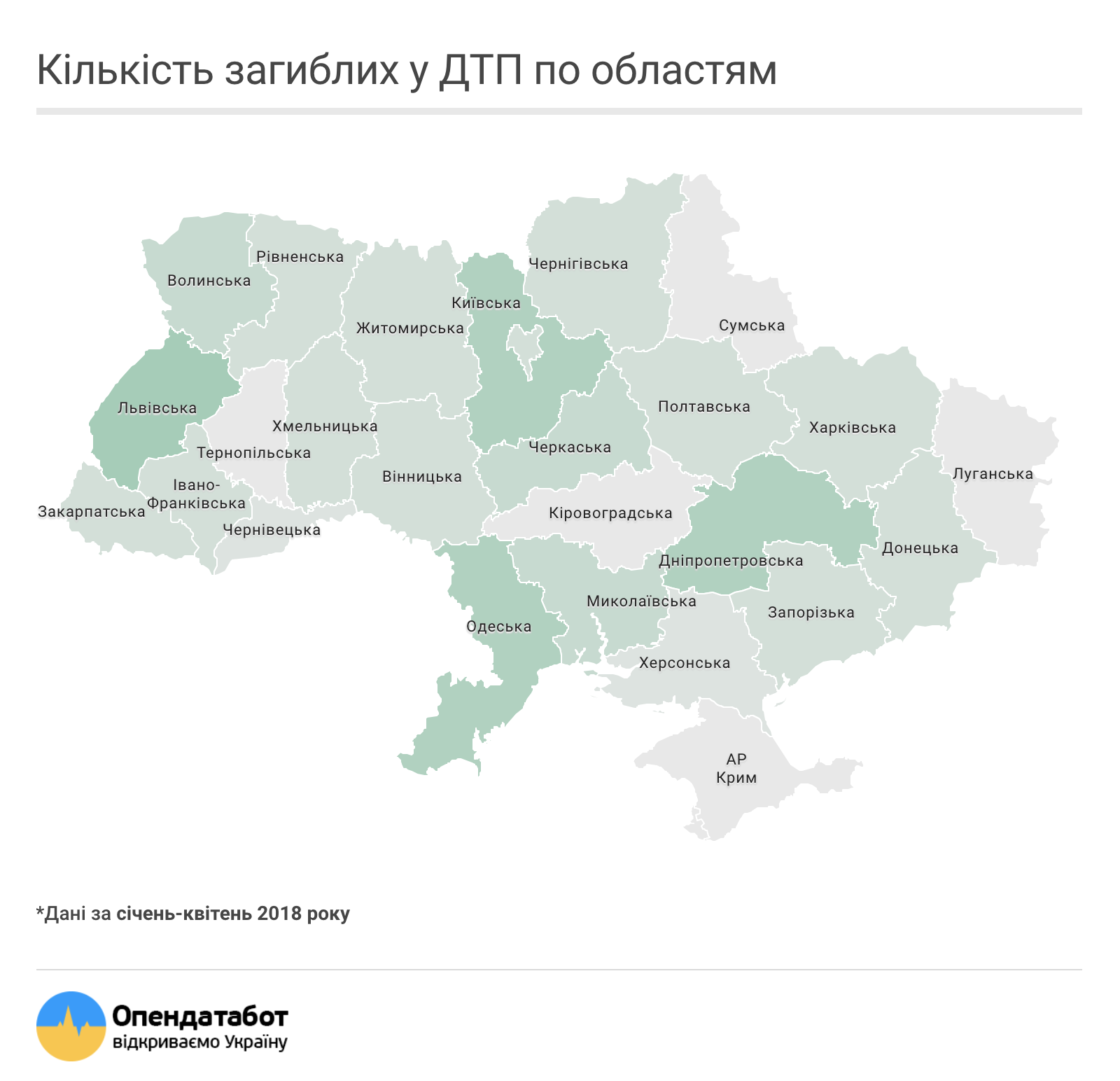 За январь-апрель 2018 года больше всего ДТП произошло в Киеве - 11 990 аварий (в Днепропетровской области - 3 228). А вот по количеству ДТП со смертельным исходом столица далеко не первая (32 случая), лидируют в этом антирейтинге Львовская (75), Одесская (60) и Днепропетровская (60) области.