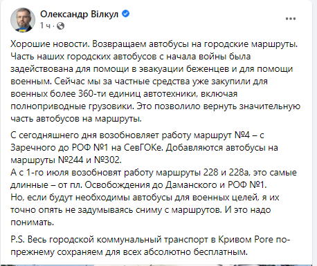 С сегодняшнего дня возобновляет работу маршрут №4 – с Заречного до РОФ №1 на СевГОКе. Добавляются автобусы на маршруты №244 и №302. А с 1 июля возобновят работу маршруты №228 и №228а, это самые длинные – от пл. Освобождения до Даманского и РОФ №1", - написал Александр Вилкул.