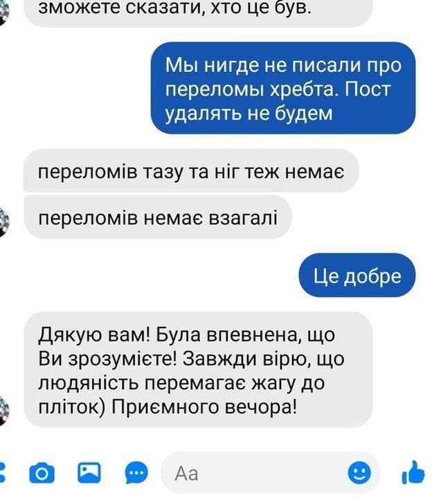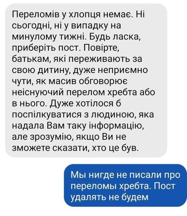 В публикации также прикреплены скрины, где кто-то опровергает данную информацию и говорит, что у учащегося никакого перелома нет.