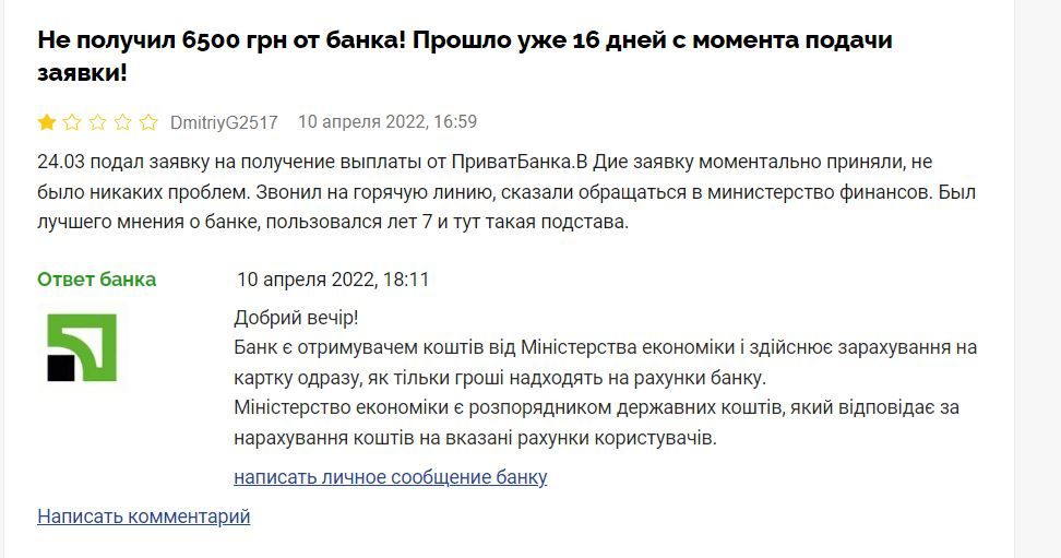 На сайте издания Минфин, на вопрос одного из клиентов ответил представитель Приватбанка. В своей жалобе пользователь пожаловался на то, что ему не зачислили 6500 гривен єПідтримки, в обещанные 10 дней. Он подал заявку 24 марта, но по состоянию на 10 апреля денег не получил.