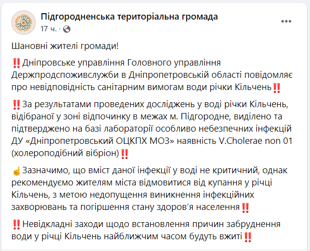 "Днепровское управление Главного управления Госпродпотребслужбы в Днепропетровской области сообщает о несоответствии санитарным требованиям воды реки Кильчень. По результатам проведенных исследований, в воде реки Кильчень, отобранной в зоне отдыха в пределах г. Подгородное, выделено и подтверждено на базе лаборатории особо опасных инфекций ГУ «Днепропетровский ОЦКПХ МЗ» наличие V.Cholerae non 01 (холероподобный вибрион)", - говорится в сообщении громады.