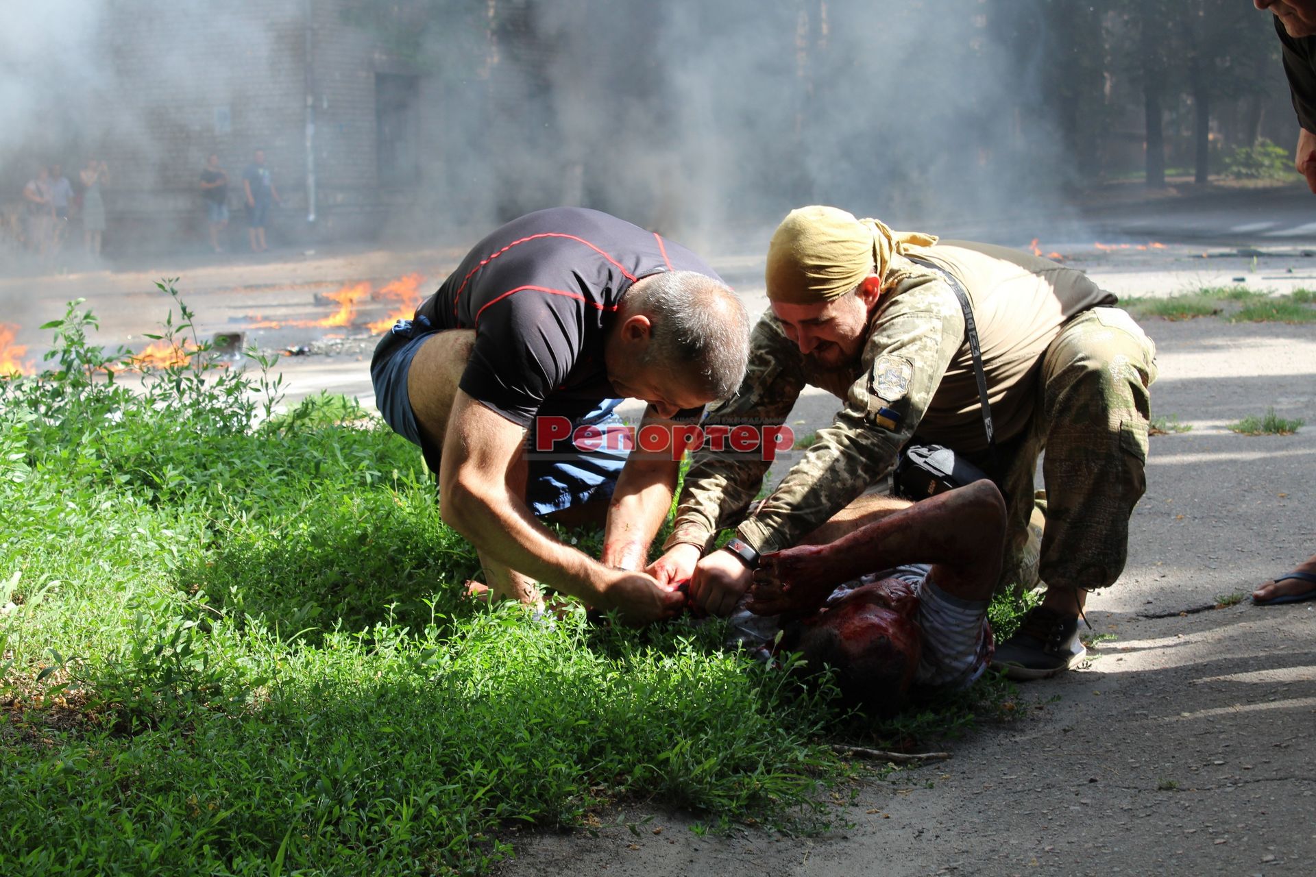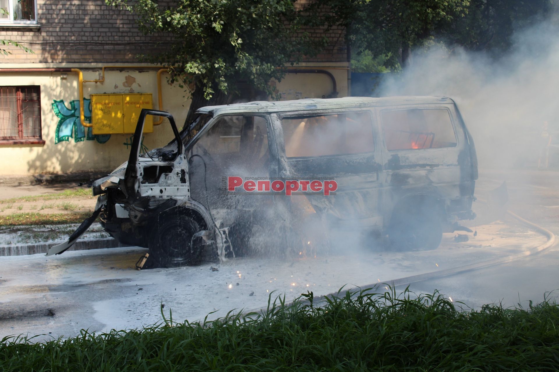 Взрыв спровоцировал крупное возгорание автомобиля «Volkswagen Transporter» с надписью «Дніпро». Водитель микроавтобуса успел выпрыгнуть из салона. Мужчине быстро оказали медицинскую помощь.
