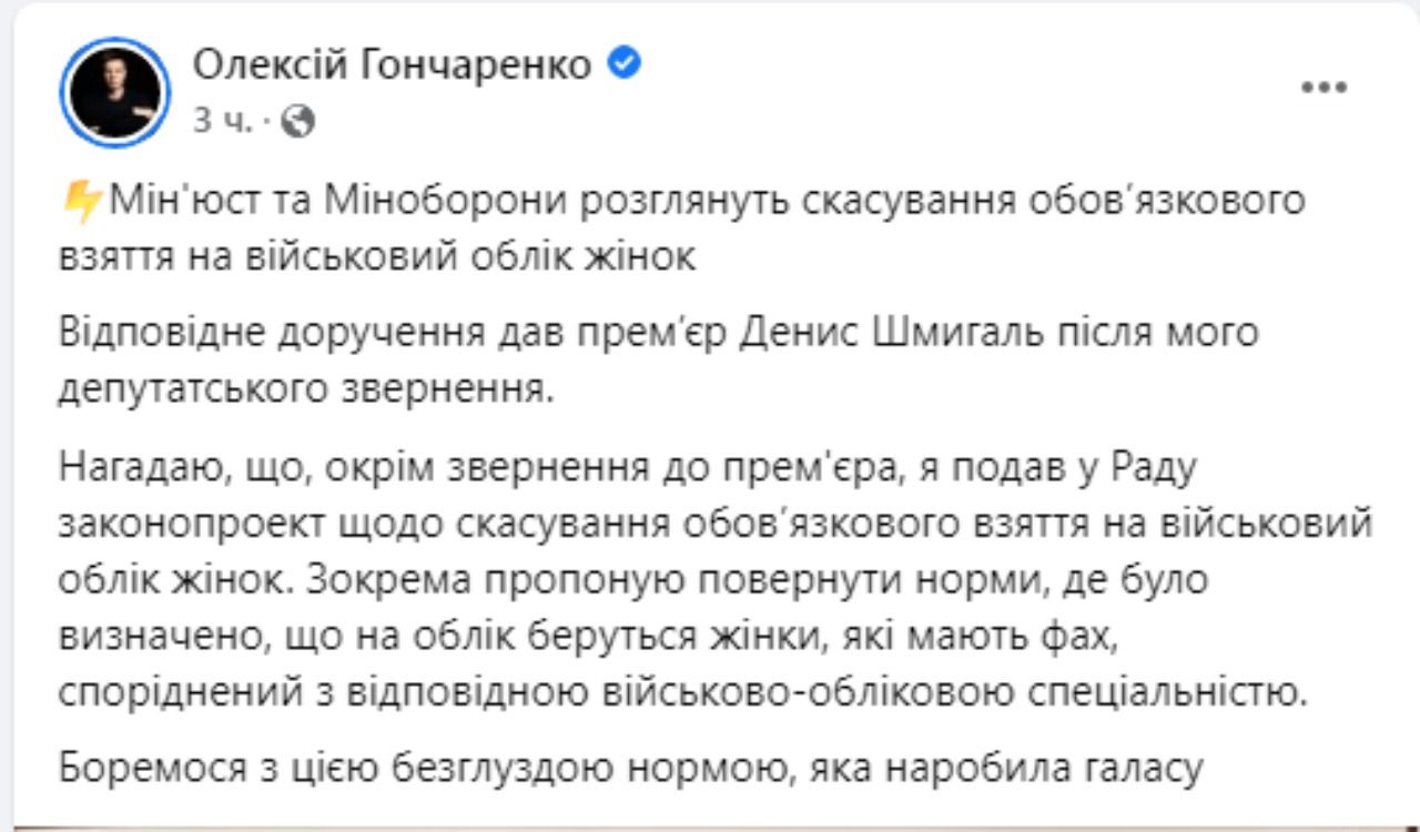 Также Гончаренко рассказал, что подал в Верховную Раду законопроект об отмене обязательного взятия на воинский учет женщин. В нем предлагается вернуть нормы, где было определено, что на учет берутся женщины, имеющие профессию, родственную соответствующей воинско-учетной специальности.