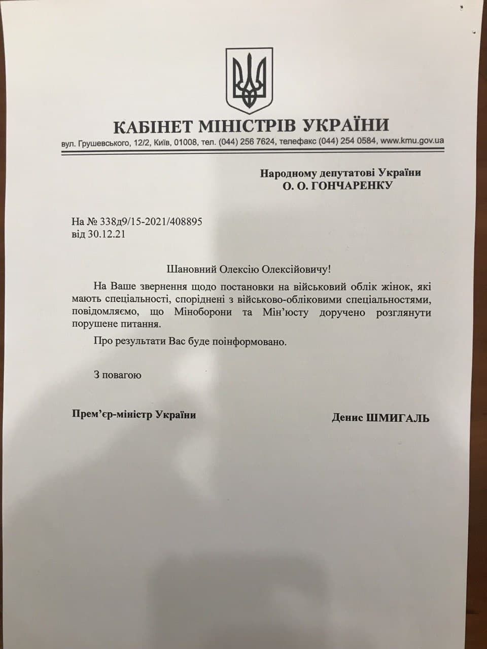 "По Вашему обращению относительно постановки на воинский учет женщин, имеющих специальности, родственные воинско-учетным специальностям, сообщаем, что Минобороны и Минюсту поручено рассмотреть поднятый вопрос", – говорится в документе.
