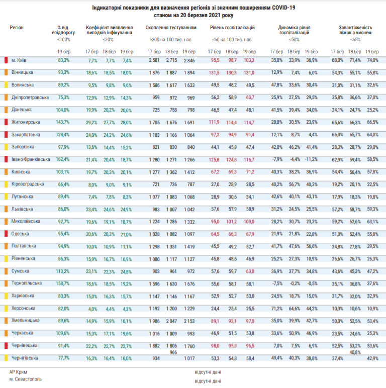 По состоянию на 20 марта, сложная эпидемиологическая ситуация в Киеве, Одесской, Черновицкой, Житомирской, Ивано-Франковской и Закарпатской областях. Они находятся в «красной» зоне карантина.