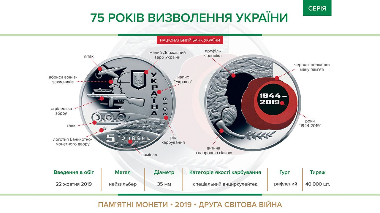 К 75-й годовщине освобождения Украины от нацистов Национальный банк выпустил одноименную памятную монету номиналом 5 гривен.