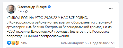 О том, как прошла ночь и какая ситуация в Криворожском районе на утро 29 июня, сообщил председатель военной администрации Кривого Рога Александр Вилкул.
