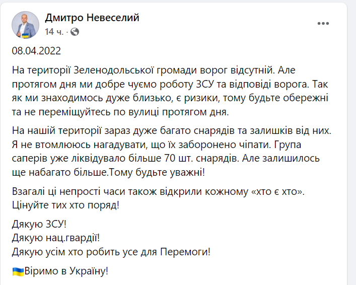 «На нашей территории сейчас много снарядов и остатков от них. Я не устаю напоминать, что их запрещено трогать. Группа саперов уже ликвидировала более 70 снарядов. Но осталось еще гораздо больше. Поэтому будьте внимательны! Спасибо ВСУ! Спасибо Нацгвардии! Спасибо всем, кто делает все для Победы!» — написал Дмитрий Невеселый.