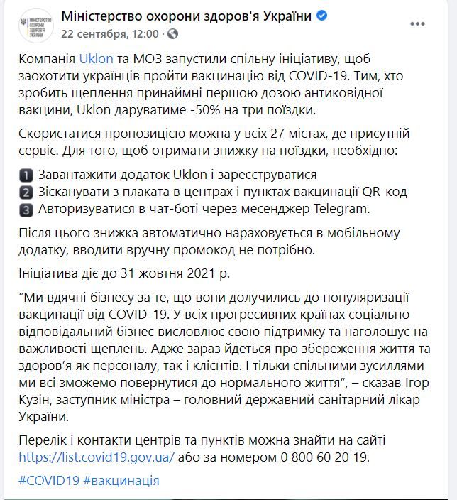 В Министерстве здравоохранения продолжают активно агитировать граждан, чтобы те прививались от Ковида. Теперь они совместно с сервисом такси Uklon дарят промокоды на три поездки в такси со скидкой 50%. Данное предложение действует во всех городах, где работает Uklon. Пока их 27, и Днепр входит в этот список.