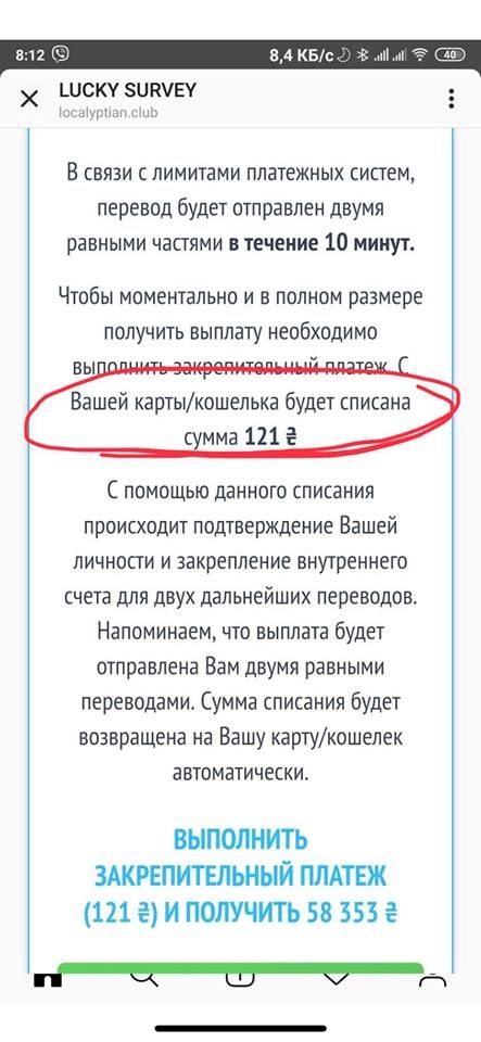 Также может появится сообщение, что для выплаты средств нужно внести некий «закрепительный платеж», который якобы подтверждает вашу личность. Таким образом злоумышленники мало того, что получают деньги с таких «платежей», но еще и имеют доступ к вашим картам.