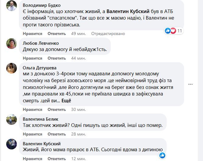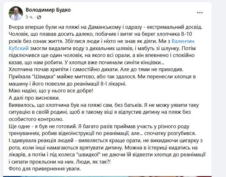 "Чоловік, який плавав досить далеко, побачив і витяг на берег хлопчика 8-10 років без ознак життя. Збіглися люди і ніхто не знав, як діяти. Ми змогли видалити воду з дихальних шляхів, і мабуть зі шлунку. Потім підключився ще один чоловік, на якого всі горлали, а він впевнено і спокійно казав, що нам робити. У хлопця вже починали синіти кінцівки.. Потім хлопчина почав хрипіти і самостійно дихати. Але до тями не приходив", - розповідає Володимир.