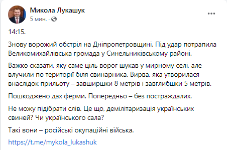 Не можу підібрати слів. Це що, демілітаризація українських свиней? Чи українського сала? Такі вони – російські окупаційні війська, - зазначив Микола Лукашук.