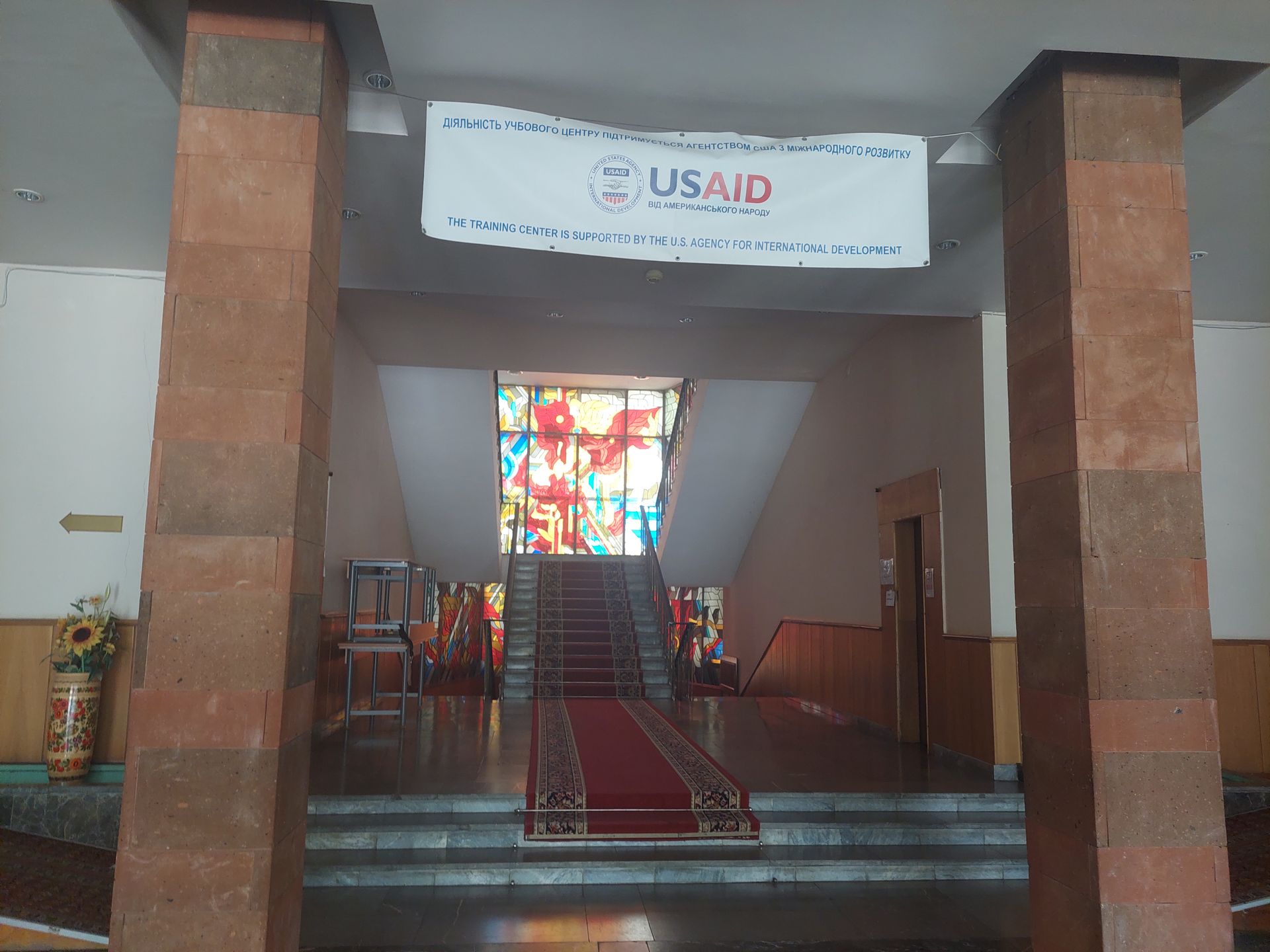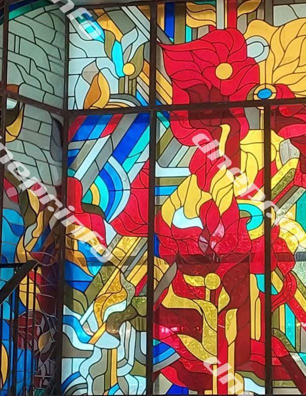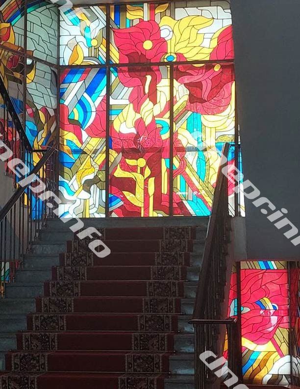 В коридорах и на ступеньках лежат выцветшие советские ковры с орнаментами. На каждом из 4-х этажей здания сохранились витражи 60-х годов. Они находятся на лестничных пролетах.