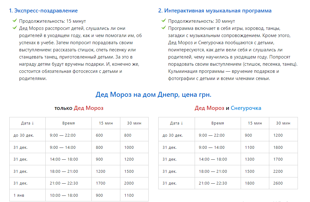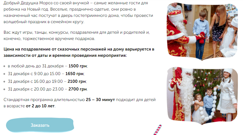 Если родители хотят, чтобы ребенка поздравил только Дед Мороз и при этом его поздравление с вручением подарка длилось 10 минут - нужно отдать 500 грн. Кому нужно длинное поздравление на полчаса – с тех попросят 900 грн.