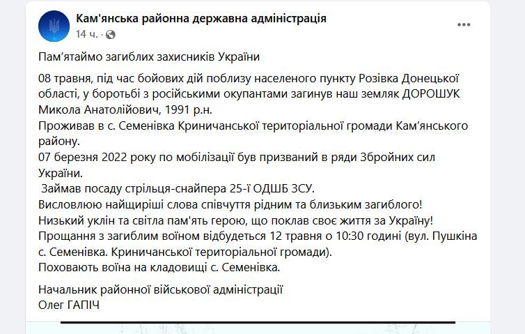 8 мая во время боевых действий на Донеччине погиб Николай Дорошук. 7 марта его мобилизовали в ВСУ, он был стрелком-снайпером 25-й отдельно-десантной Сичеславской бригады ВСУ.
