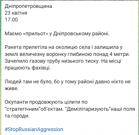 «Есть «прилет» в Днепровском районе. Ракета прилетела на окраину села и оставила в земле огромную воронку глубиной более 4 метров. Задело газовую трубу низкого давления. На месте работают специалисты. Людей там не было, потому что в этом районе давно никто не живет. Оккупанты продолжают целить по «стратегическим» объектам. «Демилитаризуют» наши поля и огороды», — написал Резниченко.