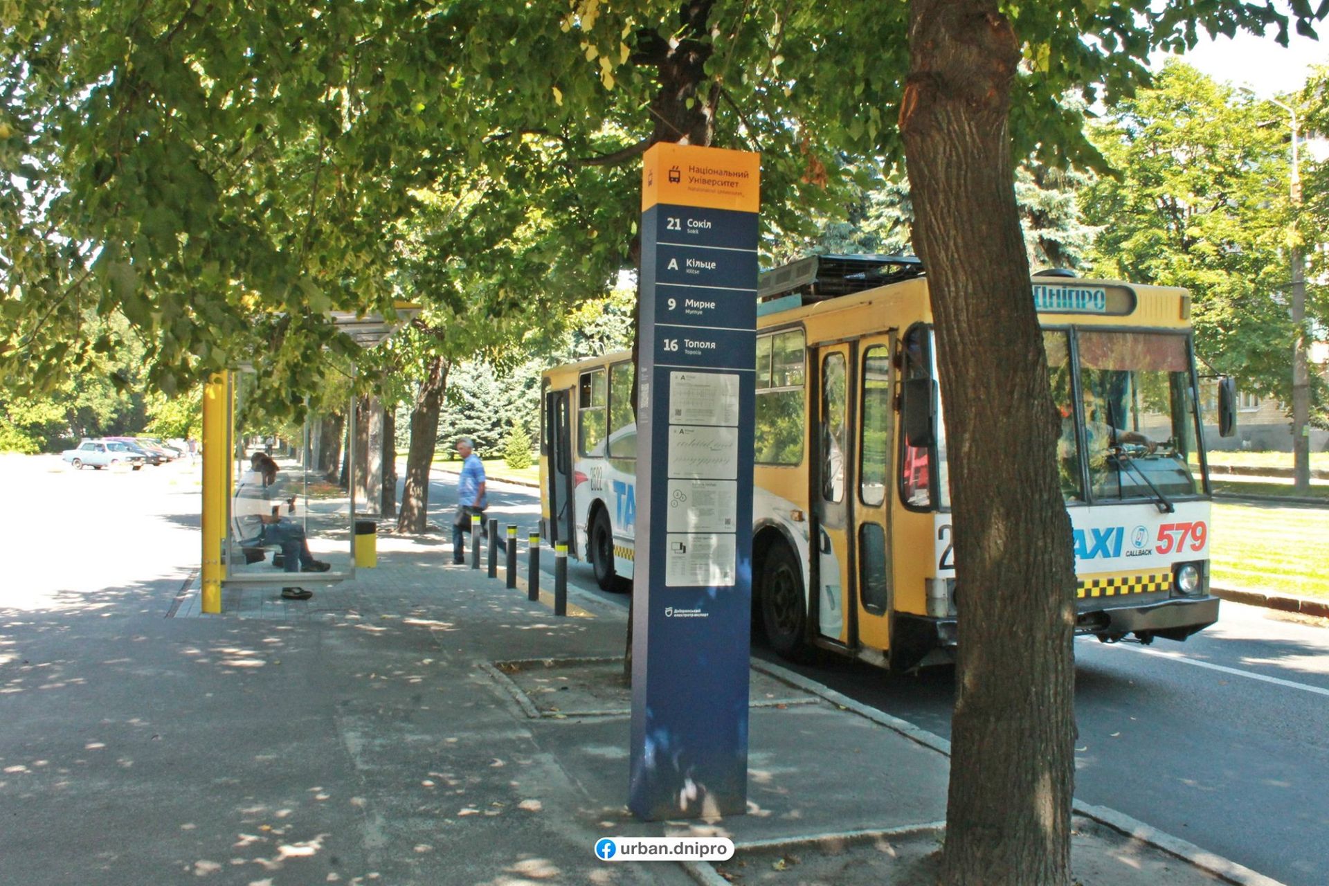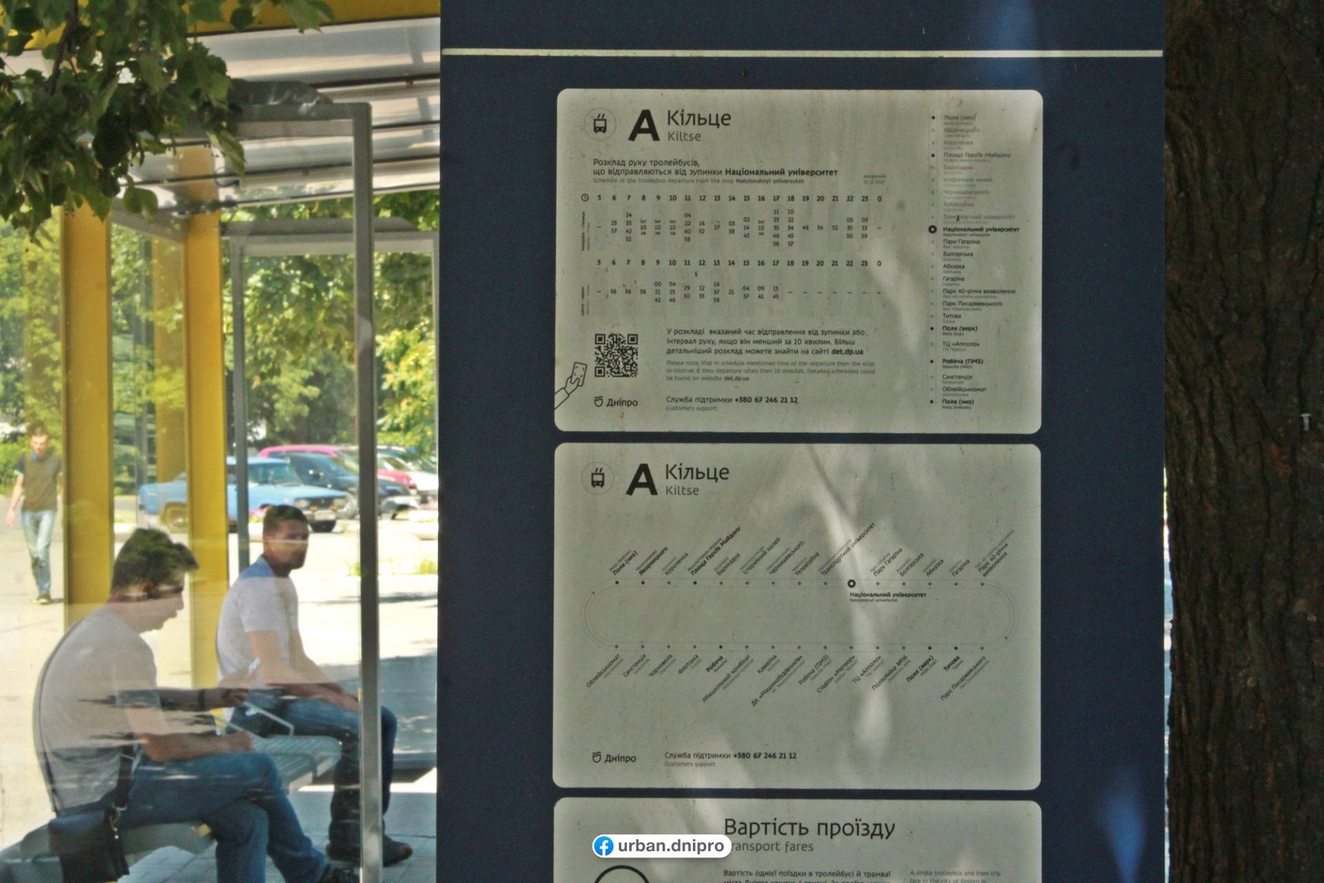 Кроме того, dnipro.design несколько месяцев назад установили здесь тестовый пилон, на котором указано всю важную для пассажира информацию: перечень маршрутов, курсирующих через остановку, расписание их движения и схемы маршрутов.
