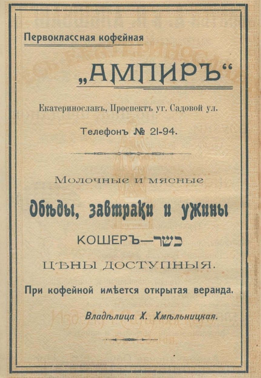 Выпить кофе жителей города зазывали в «первоклассную кофейню» с доступными ценами и кошерными блюдами.