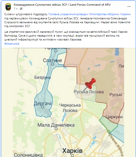 "Силами штурмового подразделения Главного управления разведки Министерства обороны Украины под руководством командующего Сухопутными войсками ВСУ, генерал-полковника Александра Сырского освобождено от оккупантов село Русская Лозовая в Харьковской области. Сейчас оно полностью под контролем ВСУ.