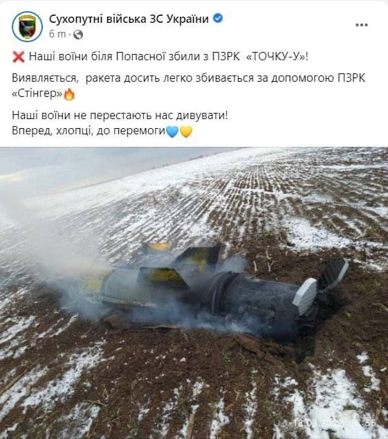 "Наши воины возле Попасной сбили с ПЗРК "ТОЧКУ-У". Оказывается, ракета довольно легко сбивается с помощью ПЗРК "Стингер". Наши воины не перестают нас удивлять! Вперед, ребята, к победе", — говорится в сообщении.