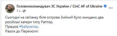 "Сегодня на рассвете у острова Змеиный были уничтожены два российских катера типа Раптор. Работает Байрактар".