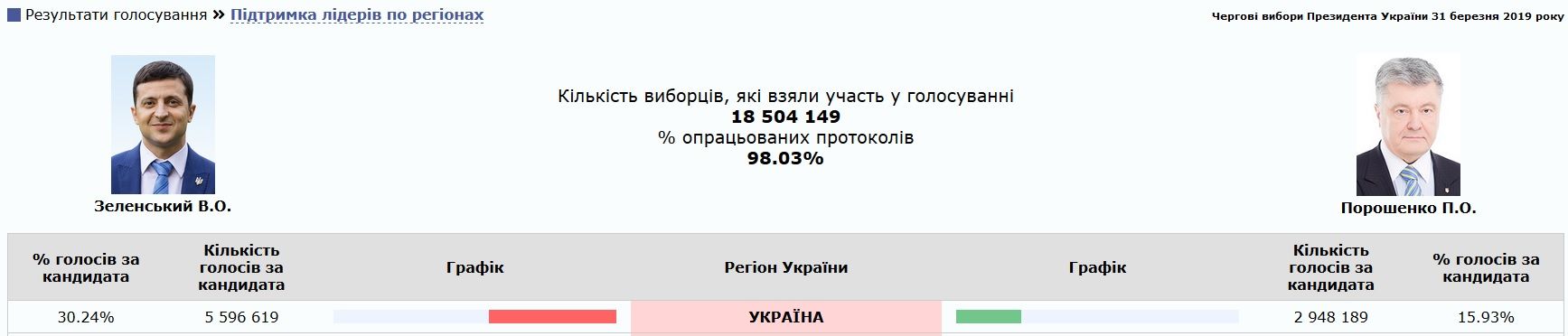 Лидирует Владимир Зеленский (30,26% и 5,582 миллионов голосов), на втором месте идет Петр Порошенко (15,92% и 2,937 миллионов голосов).