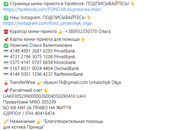 Если у вас есть желание помочь Принцу, то сделать это можно перечислив деньги приюту. Скрин с реквизитами ниже.