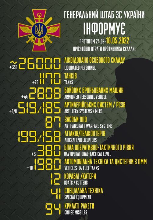 Общие боевые потери противника с 24.02 по 10.05 ориентировочно составили: